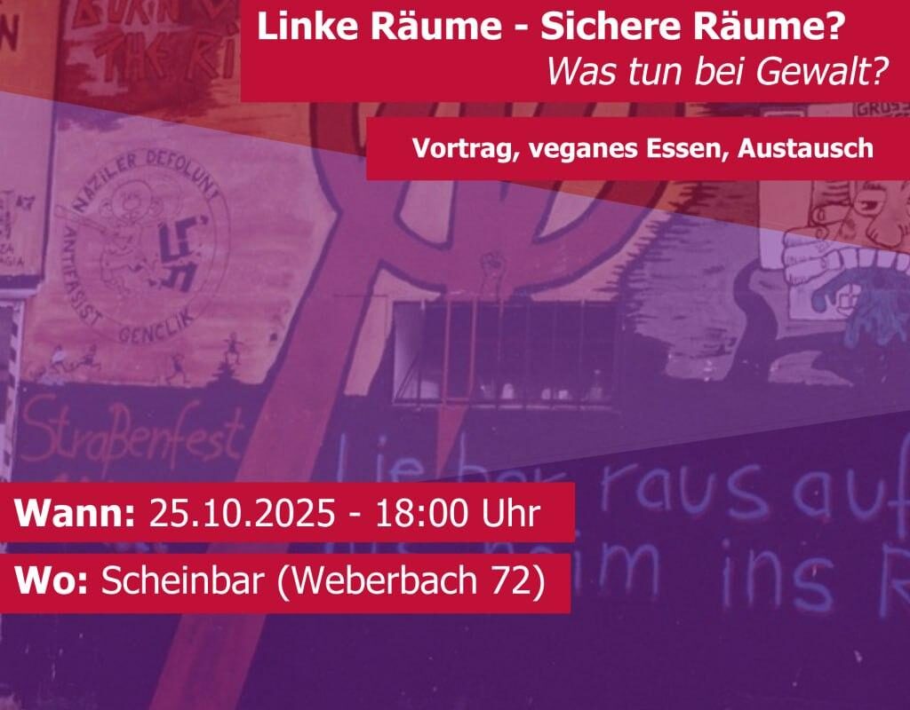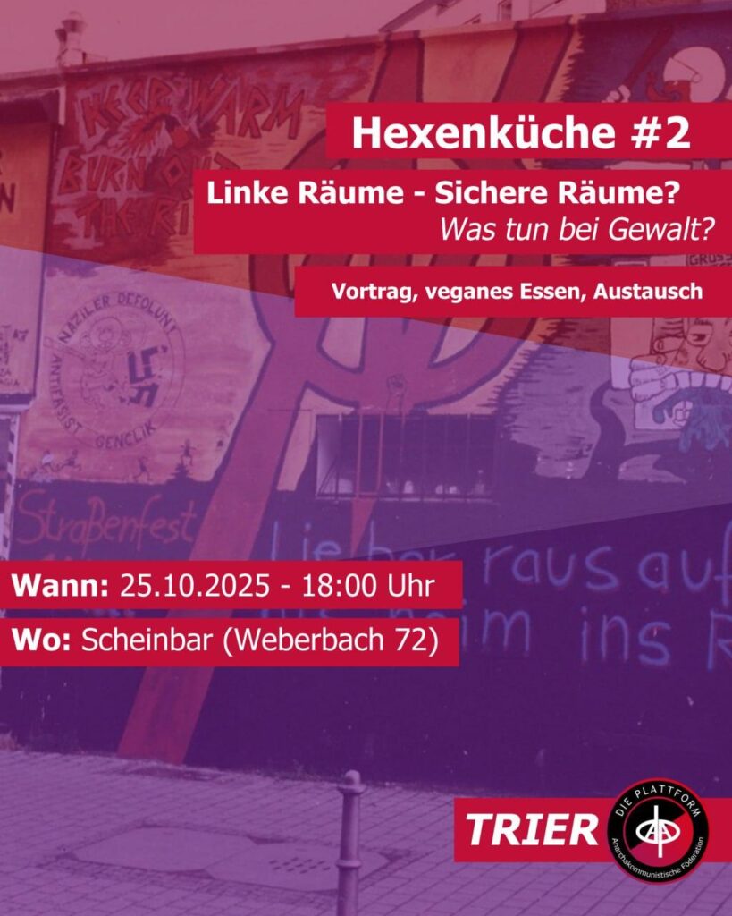 am 25.10.2025 fand ab 18:00 Uhr unsere dritte Hexenküche in diesem Jahr unter dem Titel Linke Räume – Sichere Räume? was tun bei Gewalt statt. Mit Blick auf eigene Erfahrungen in der Aufarbeitung von Gewalt in linken Räumen und mit Bezug auf Material, das verschiedene Gruppen, unter anderem vor allem response aus Berlin in den vergangen Jahren aus ihrer Praxis heraus erarbeitet haben, konnten wir uns der Frage widmen, wie wir als emanzipatorische Gruppen und Bewegungen mit der Gewalt in unseren eigenen Kontexten umgehen können.